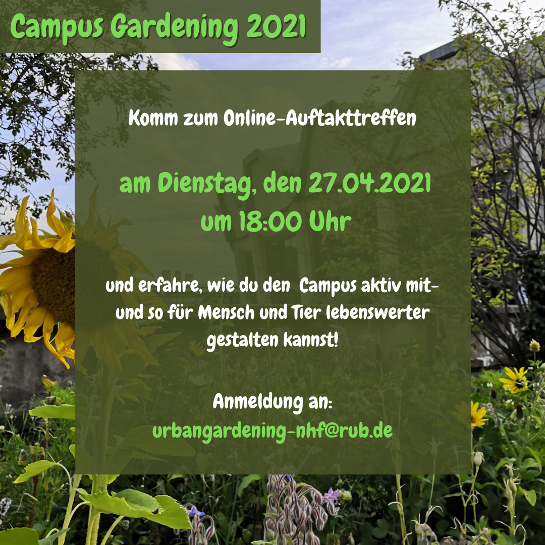 Am Dienstag, dem 27.04.2021, findet für alle, die planerisch und gärtnerisch im Projekt „Campus Gardening“ aktiv werden möchten, um 18:00 Uhr eine Online-Infoveranstaltung statt.