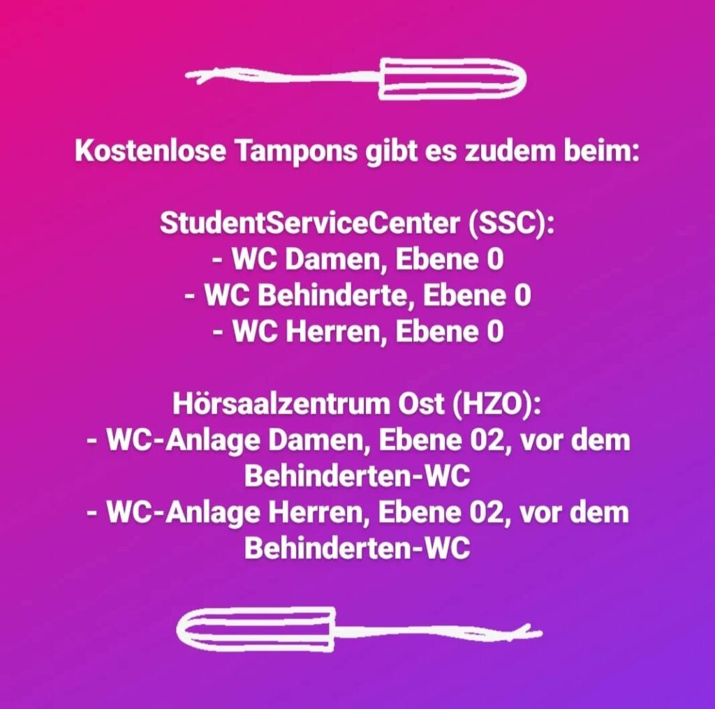 Übrigens: Kostenlose Tampons erhaltet ihr zusätzlich auch im SSC und HZO.