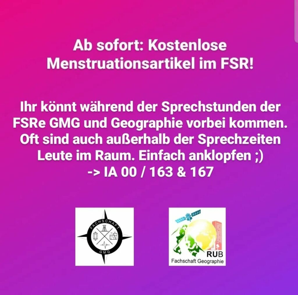 Ab sofort gibt es kostenlose Menstruationsartikel in den FSRen Geographie und GMG. Ihr könnt während der Sprechstunden vorbei kommen (die aktuellen Sprechstundenzeiten findet ihr hier). Oft sind auch außerhalb der Sprechzeiten Leute im Raum. Einfach anklopfen 😉 Ihr findet uns in IA 00/163 und 167.