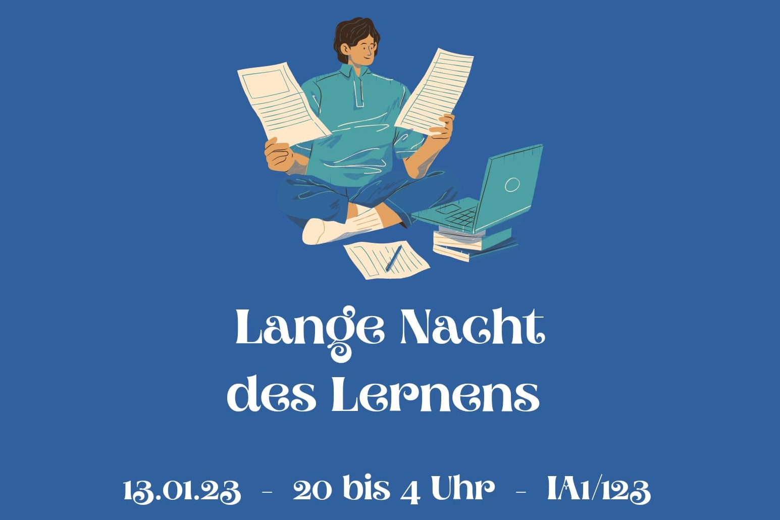 Dann komm zur Langen Nacht des Lernens! Sie findet am Freitag, den 13.01.2023 in IA 1/123 von 20 bis 4 Uhr statt. Euer Fachschaftsrat stellt euch Kaffee, Snacks und jede Menge Altklausuren zur Verfügung – dann kommt die Motivation ganz von selbst! Kommt vorbei und lasst uns zusammen die letzten Wochen aufholen!