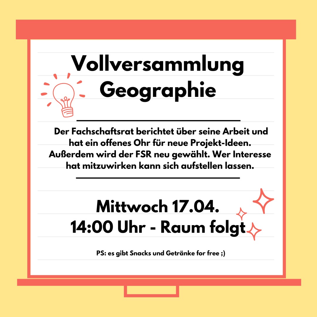 Die nächste Vollversammlung der Geographie steht an! Dazu seid ihr wie immer herzlich eingeladen 🤗 Wir würden uns freuen viele von euch zu sehen! Es wird auch Verpflegung geben 😉